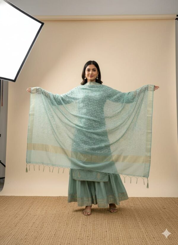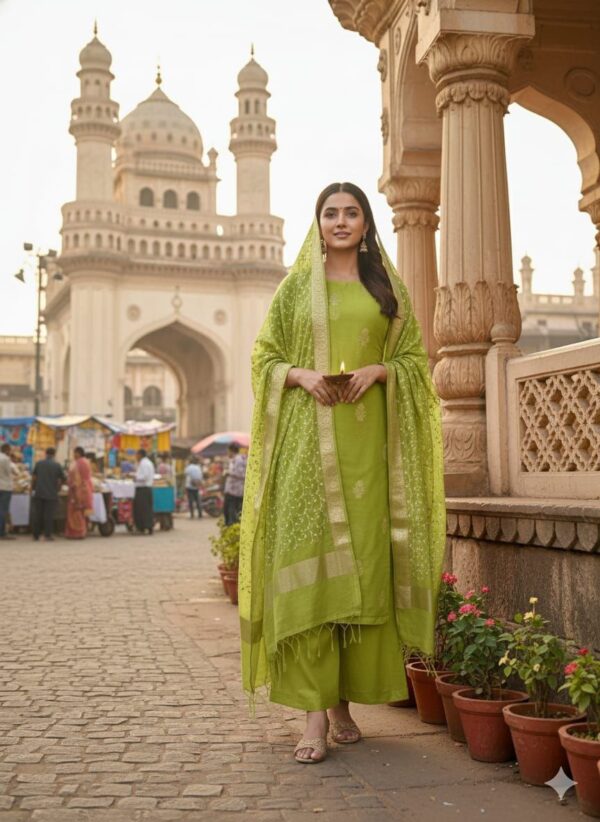 Experience the artistry of pure mercerised fabric, intricately woven with lustrous zari on the top. Complementing this grandeur is a bottom crafted from soft, breathable cotton and a mesmerizing dupatta adorned with delicate embroidery, ensuring a look that is both regal and comfortable.